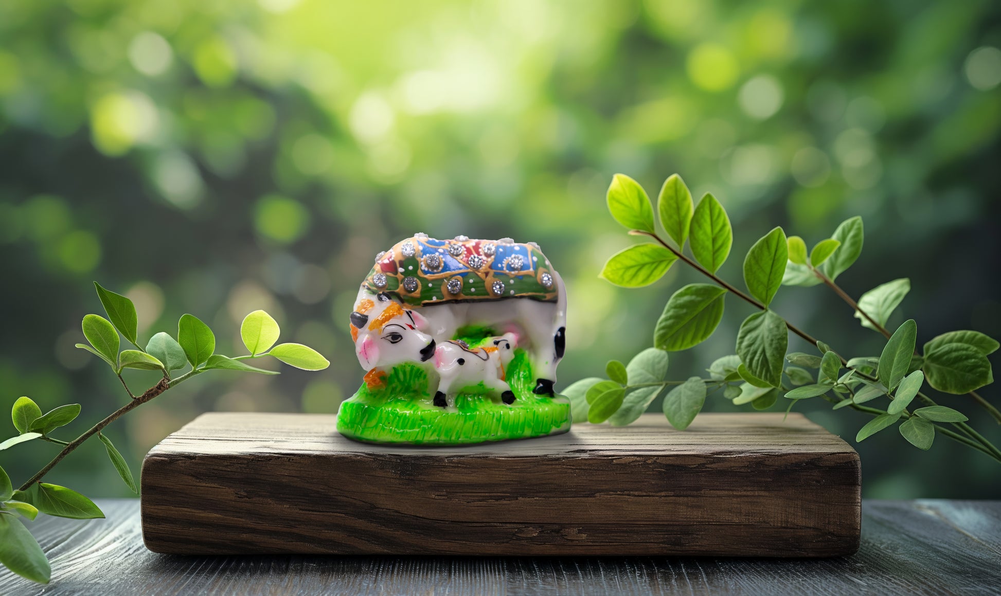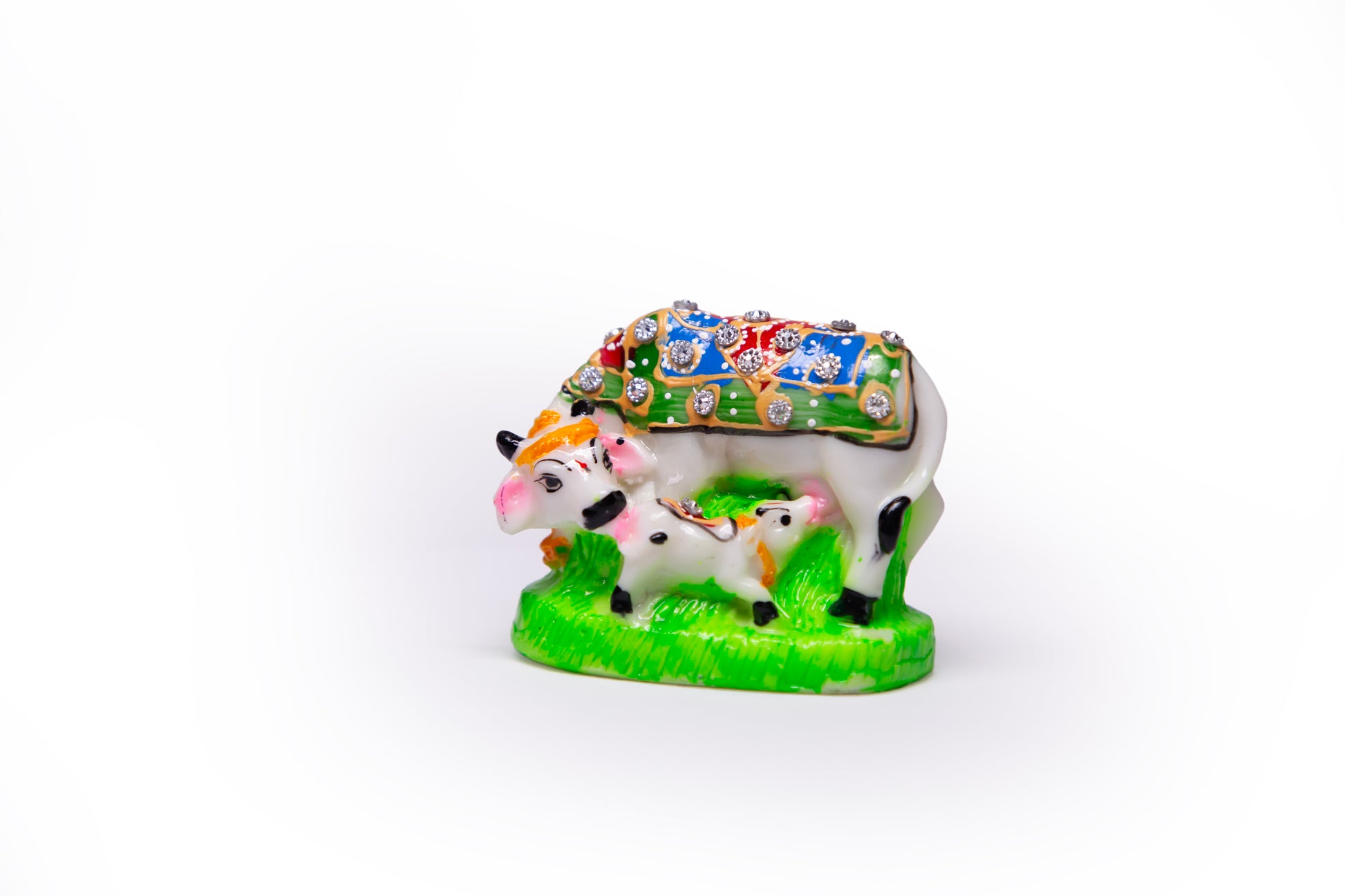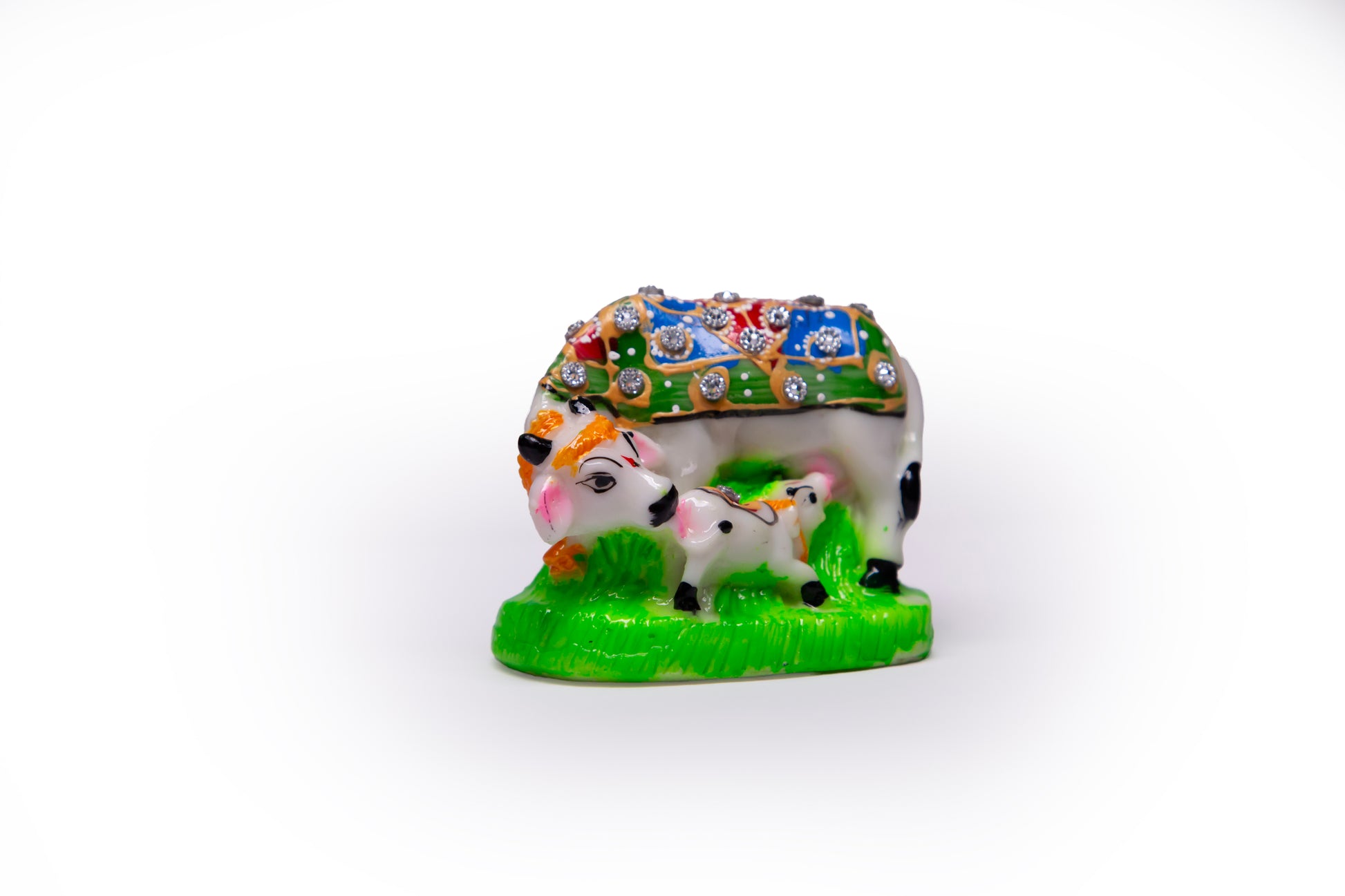 This elegant figurine captures Kamdhenu – the sacred wish-fulfilling cow in Hindu mythology – alongside her calf, seated on a lush green base that signifies fertility and prosperity. Accented with vibrant traditional hues and studded with crystal-like stones, this idol is a perfect blend of artistic elegance and spiritual essence. Whether placed on a home altar, console, or gift table, it becomes a centerpiece of divine charm and cultural richness.