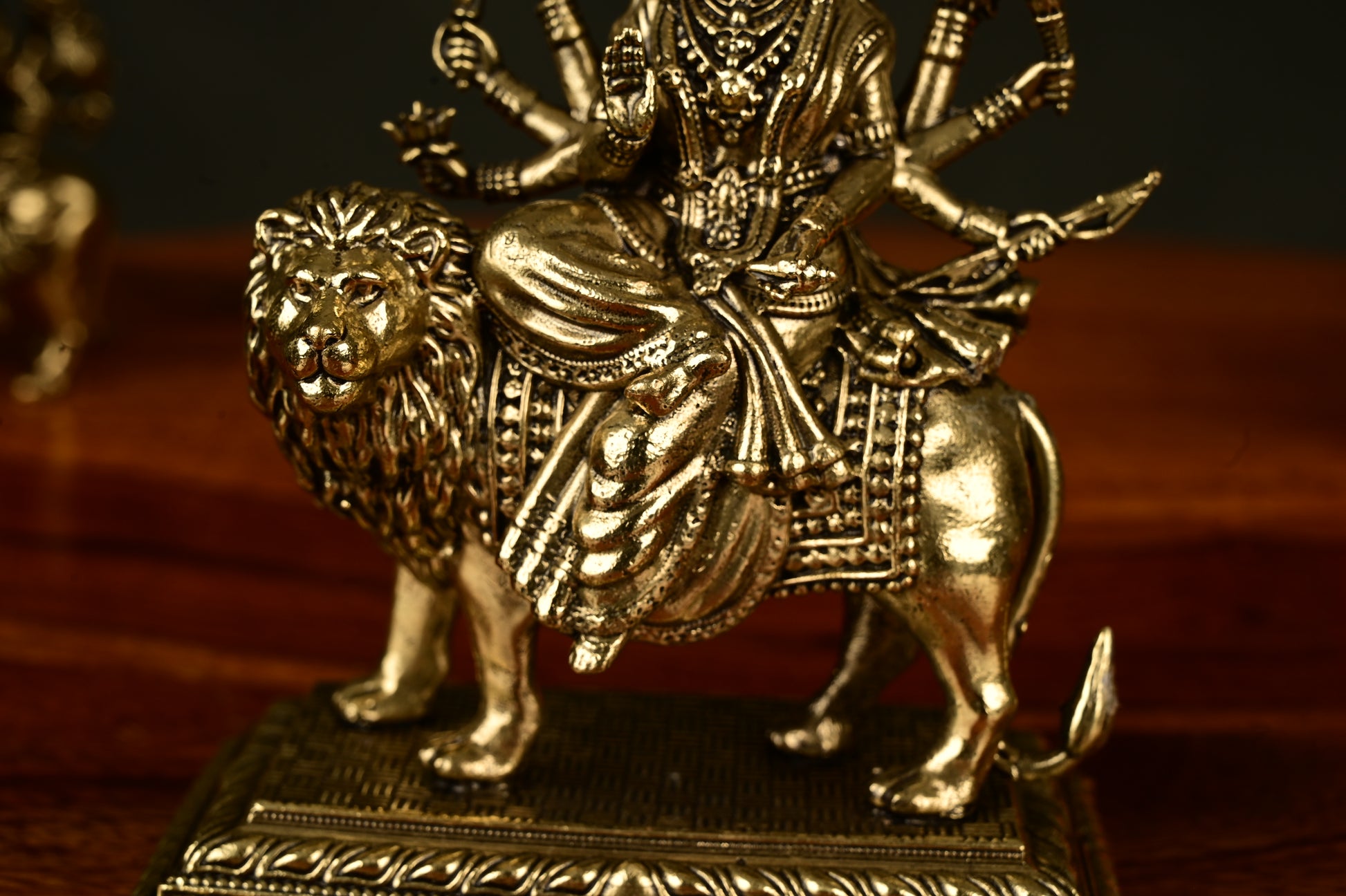 Handcrafted Brass Durga Idol on Lion on platform – 11 cm, 260 gm | Divine Home Temple Decor