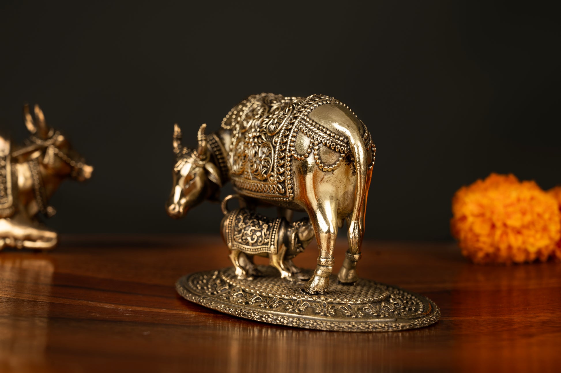 SEO Keywords: Brass Kamdhenu idol, cow and calf statue, Hindu religious decor, auspicious home decor, brass showpiece, spiritual gift, pooja room idol, prosperity symbol
