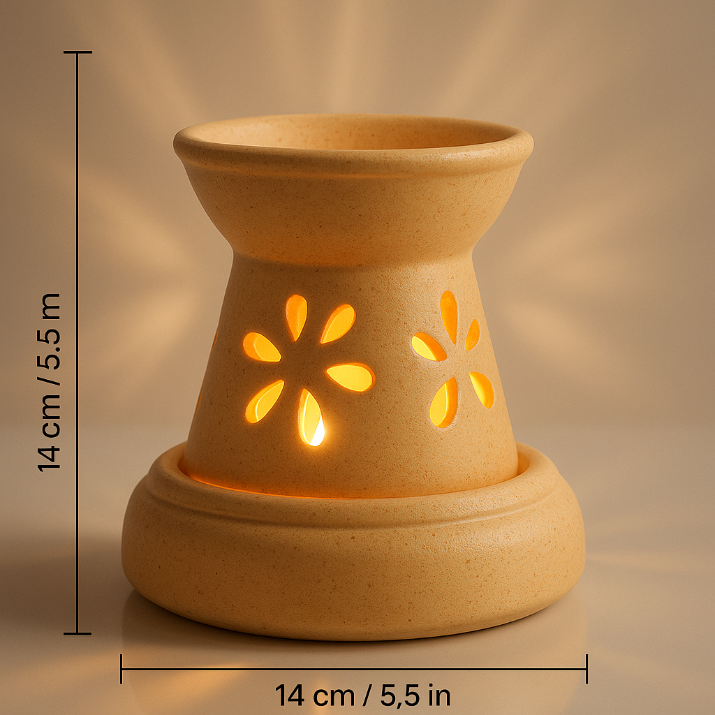 Elevate your living space with the timeless elegance of our handcrafted ceramic aroma diffuser. Designed in a graceful hourglass silhouette, this 14 cm beauty features delicate floral cutouts that softly illuminate when lit, casting mesmerizing patterns of light and shadow across the room.